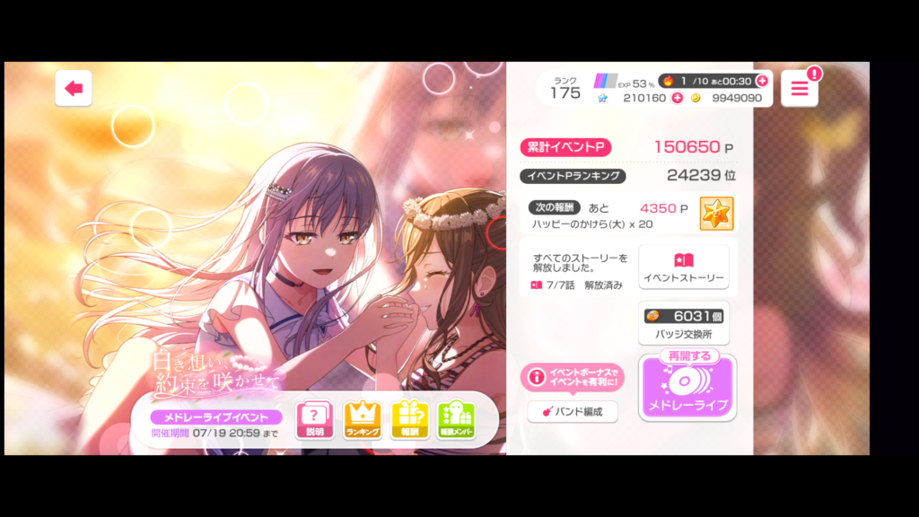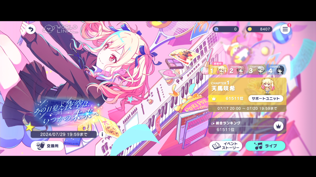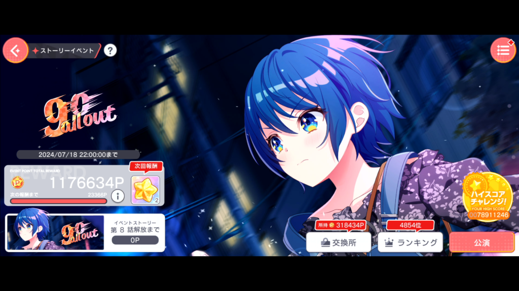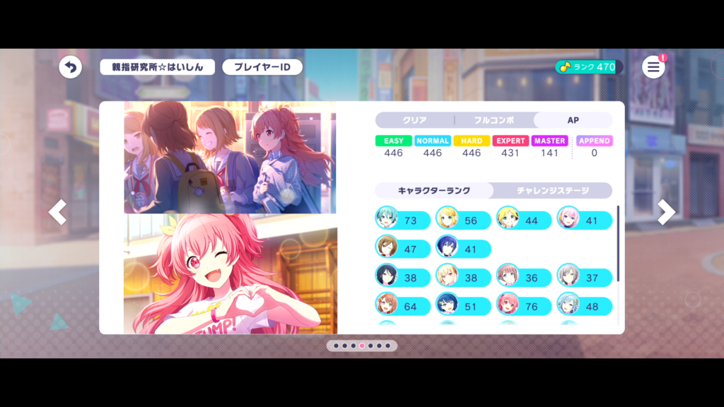 イベントはがっつりはやれず。特に最初のほうはオートを使っていたので願いの雫は1つまでしか交換できませんでした。楽曲クリア状況は順当でしょうか。(2024/7/18段階では最新曲のExpertまで網羅済み)
