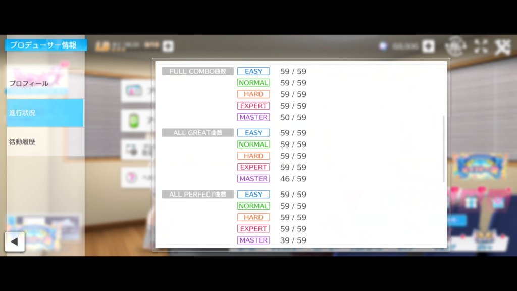 シャニソンはMaster難易度をあまりやっていませんでしたが、前回のReportから今日までで結構進めました。さっとやれそうな曲はだいたいやれたかな?