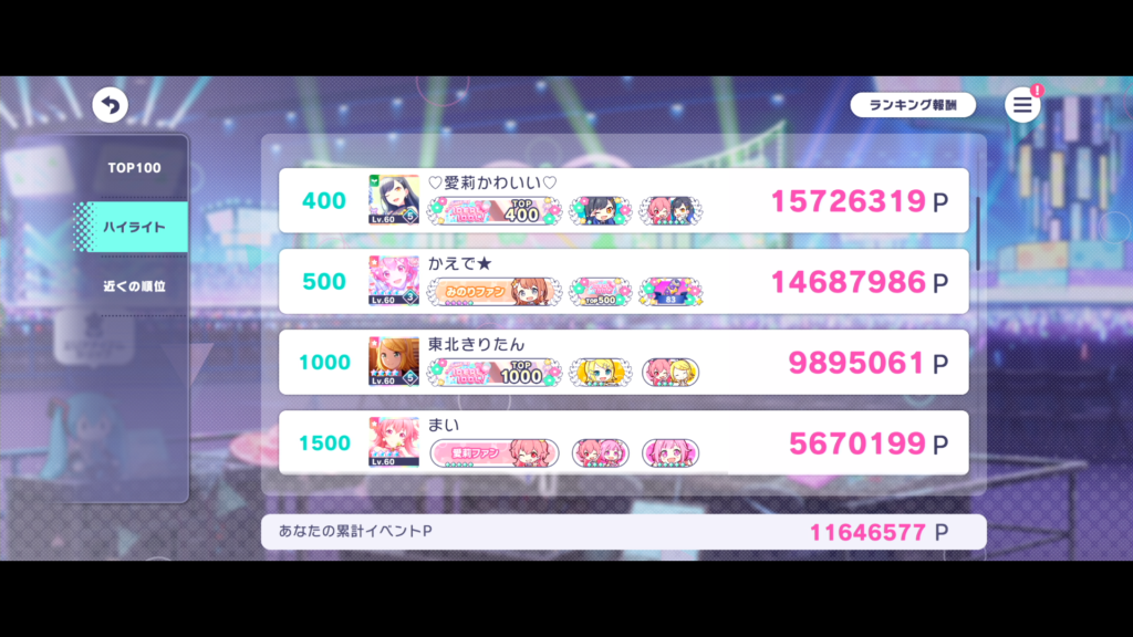 あまり順位意識していませんが、ミクだけはちょっと多めにかせぎたいなあ。
