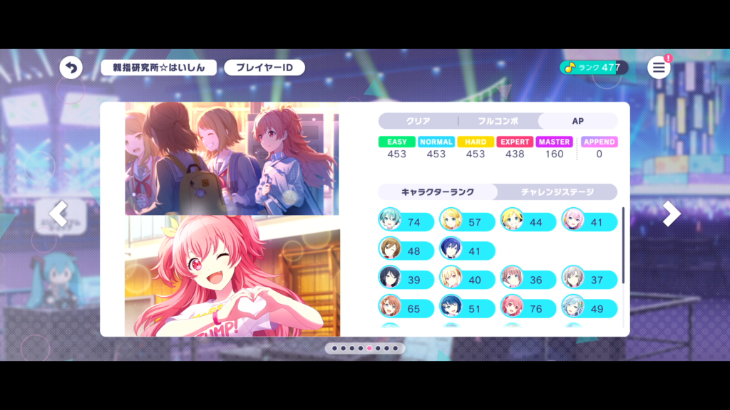 ちなみにですが、このゲーム明確にall perfect達成という判定がないのでクリア数として表示されません(音ゲー初心者的にはAPを強制されていなくて良心的?)。プラスして既にフルコンやってしまっている曲が多いので、このプロフィール欄から進捗が全く分からないです。しかし、動画にしてしまえば情報として保存、管理できるということでしっかりAPを撮っていきたいと思います。さらに内部的にはperfect率が保存されている(はず)なので、運営からはクリア情報が明確に確認できると思いますね。