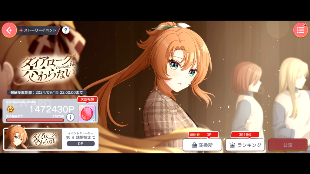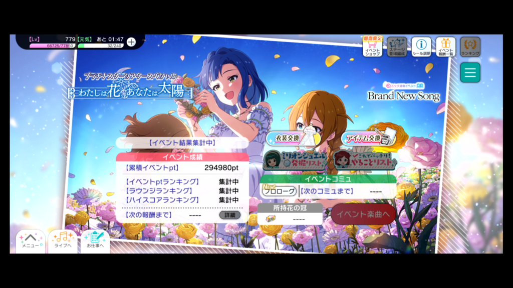 今回のユメステのイベントは順位高く終えられました。特段周回方法は変わらず、基本オートスタミナ自然回復+期限付き回復ドリンクでこの順位でした。前回のイベントからユニットを意識した編成でオート周回していますが、その走り方がよかったのでしょうか?もちろん交換所アイテムは全回収済みです。